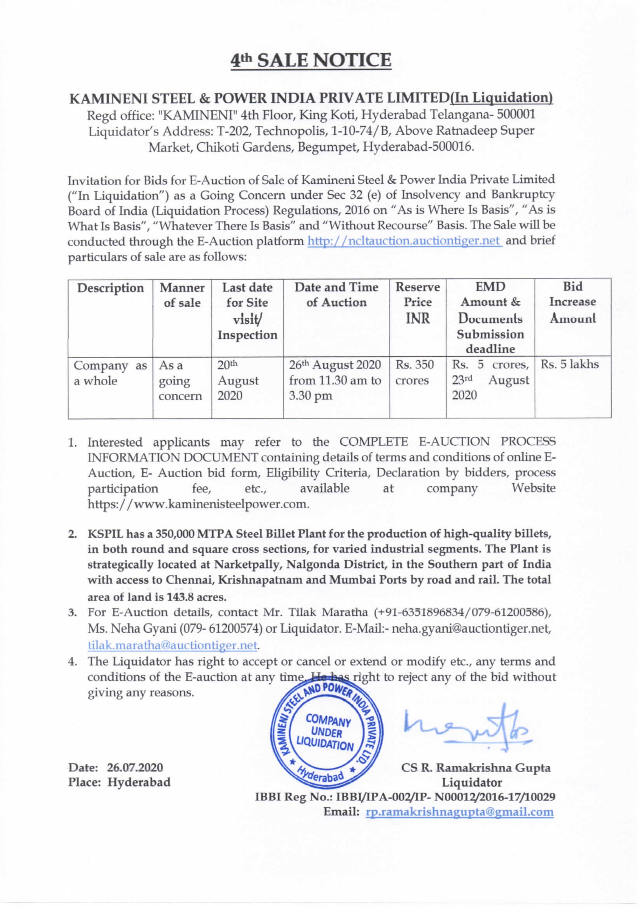 Kamineni Steel & Power India Pvt. Ltd. (KSP), is a 350,000 MTPA, Steel Billet Plant established by the Kamineni Group, for the production of high quality billets, in both round and square cross sections, for varied industrial segments. The Plant is strategically located in the Southern part of India with access to Chennai, Krishnapatnam and Mumbai Ports by road and rail. The Plant is 90 KM from the Rajiv Gandhi International Airport, Hyderabad, India.